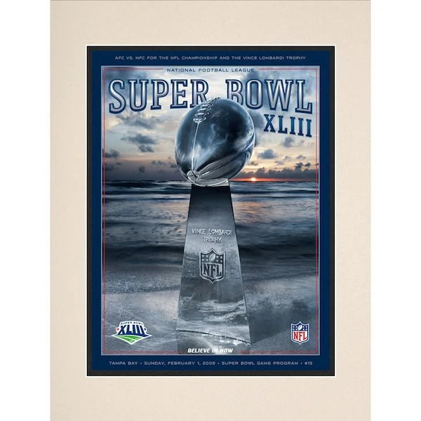 In Super Bowl XLIII on February 1, 2009, the Pittsburgh Steelers defeated the Arizona Cardinals 27-23, behind the stellar play of MVP Santonio Holmes. Here’s the original replica cover art from that day’s game program. Officially licensed by the National Football League. Beautiful 10.5″ x 14″ paper print, in 16″ x 20″ double matte. Suitable for readymade frames or hanging as is. Overall dimensions 16″ x 20″ x 1″.