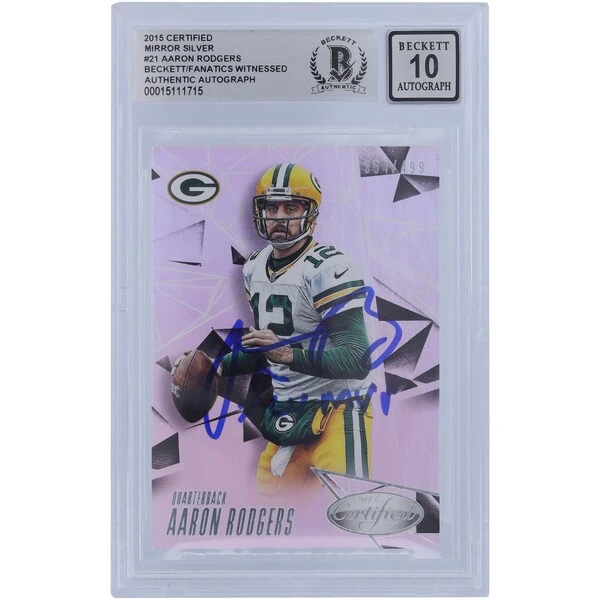 Level up your trading card collection with this Aaron Rodgers Autographed 2015 Panini Certified Mirror Silver #21 #354/499 Beckett Fanatics Witnessed Authenticated 10 Card. There’s no better way to show off your Green Bay Packers fandom. This limited-edition card features a hand-signed autograph and “SB XLV MVP” inscription by the future Hall of Fame quarterback.