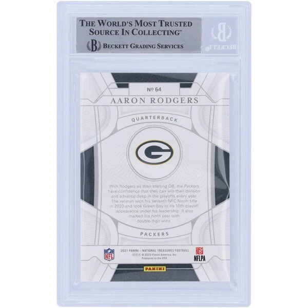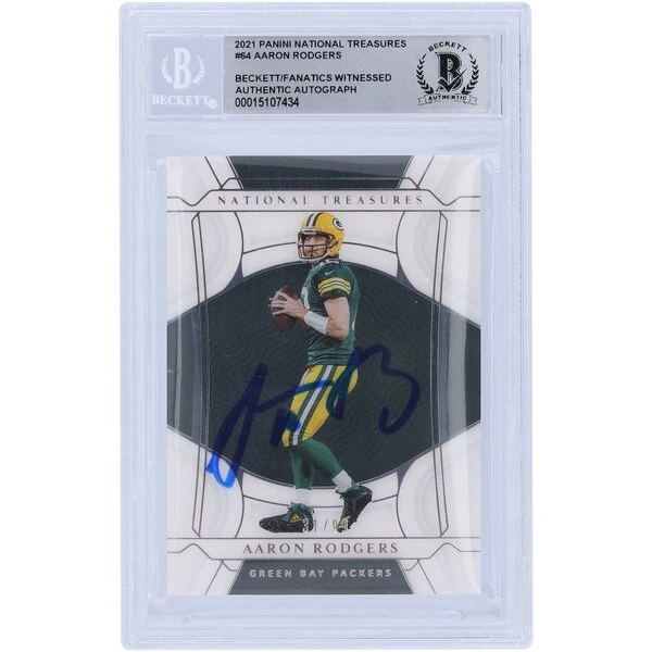 Collect one of the most exciting NFL players with this Aaron Rodgers autographed 2021 Panini National Treasures #64 #31/99 Beckett Fanatics Witnessed Authenticated Card. This eye-catching card features a striking design highlighting the Green Bay Packers star and an authenticated signature. With the impact Aaron Rodgers is making on the game, this card is a must-have for any serious NFL collectors.