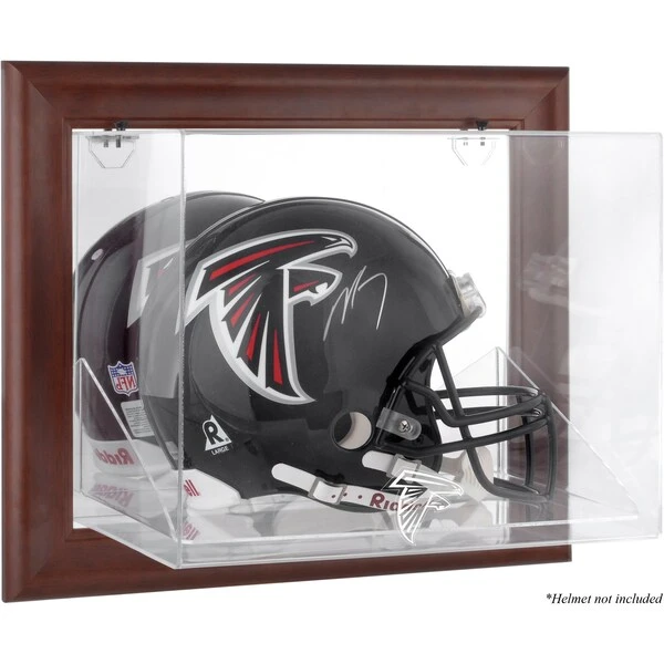 The Atlanta Falcons wall mountable logo helmet display case is made of 1/8″ thick acrylic with a brown wood frame. It features a clear acrylic removable lid with engraved team logo. Perfect for a collectible helmet. Inner measurements: 15″ x 11″ x 11 1/2″. Outer measurements: 20 1/4″ x 11 1/2″ x 17 1/2″. Memorabilia sold separately.