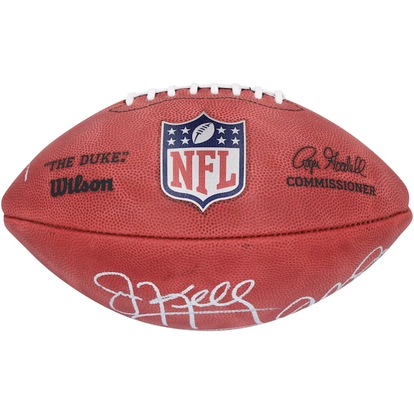 Upgrade your collection of NFL memorabilia by picking up this Joe Montana & Jim Kelly Autographed Duke Full Color Football. Between the two, they have 25 postseason wins, 13 Pro Bowl selections and seven All-Pro selections, making this ball the perfect way to remember all that these legendary quarterbacks accomplished throughout their respective careers.